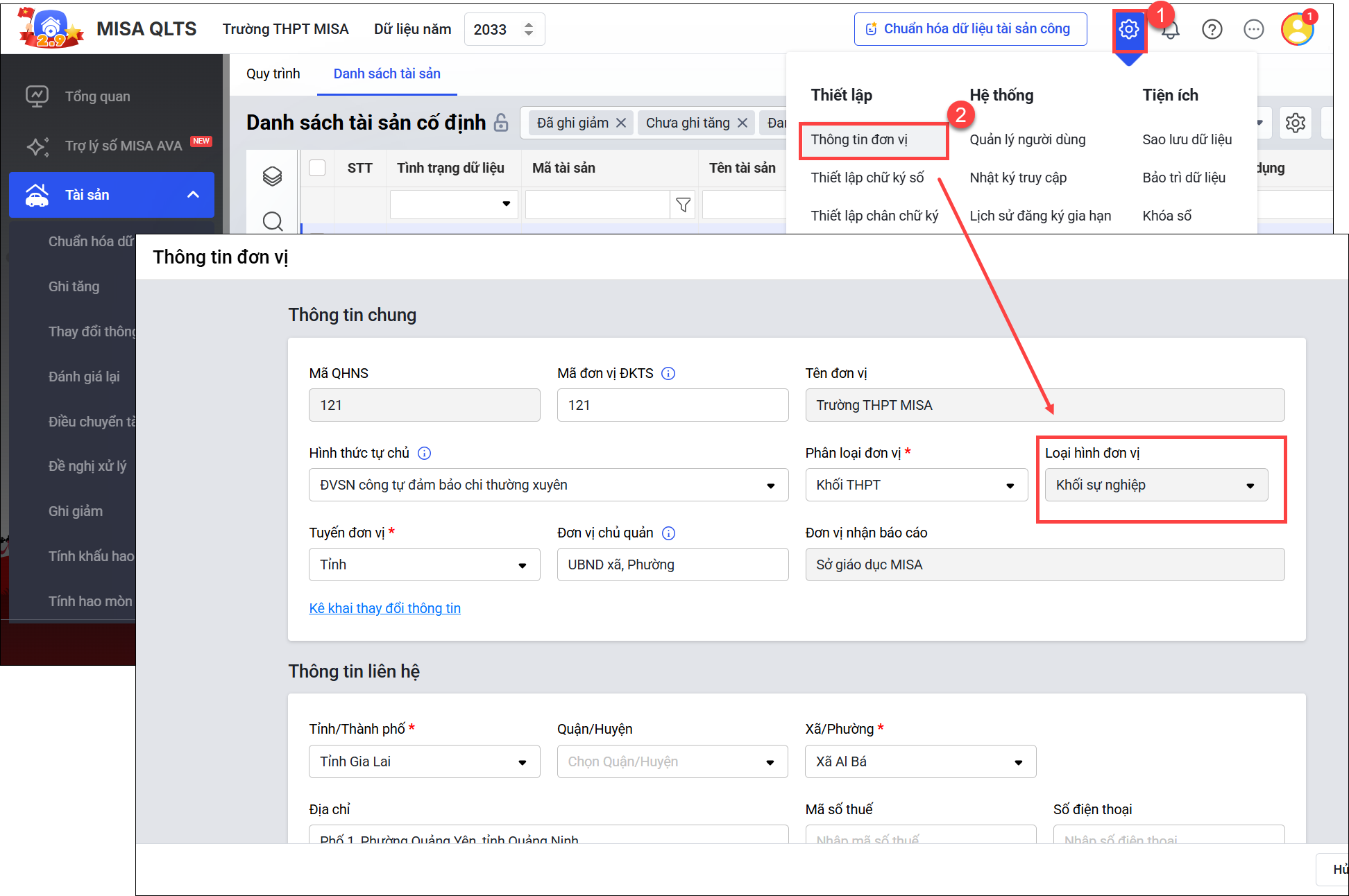 • Để Mẫu số 08b-ĐK-TSC (Phần 2) lên số liệu, cần khai báo đúng thông tin Loại hình đơn vị tại Hệ thống\Thông tin đơn vị.