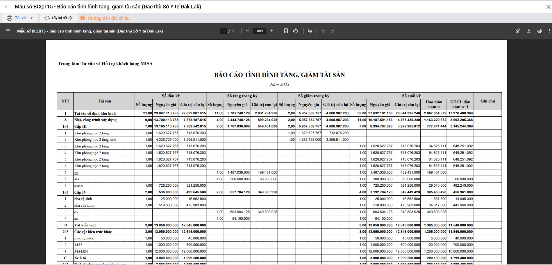 Báo cáo này phản ánh chi tiết số liệu Số lượng, Nguyên giá, Giá trị còn lại (GTCL) đầu kỳ, tăng/giảm trong kỳ và cuối năm theo đặc thù của Sở y tế tỉnh Đăk Lăk.