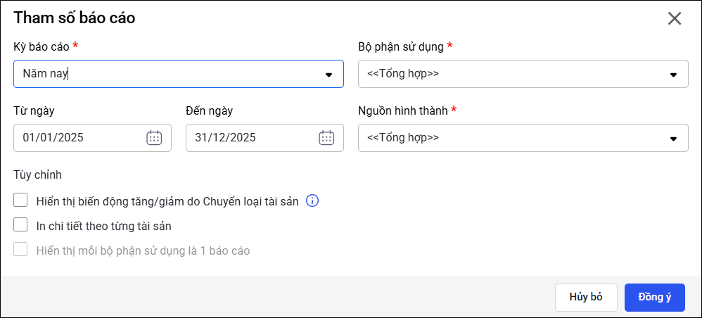 - Ô tham số Kỳ báo cáo hỗ trợ nhiều lựa chọn: chọn nhanh theo tháng, quý, năm hoặc tự xác định kỳ báo cáo bằng cách nhập “Từ ngày – Đến ngày”.