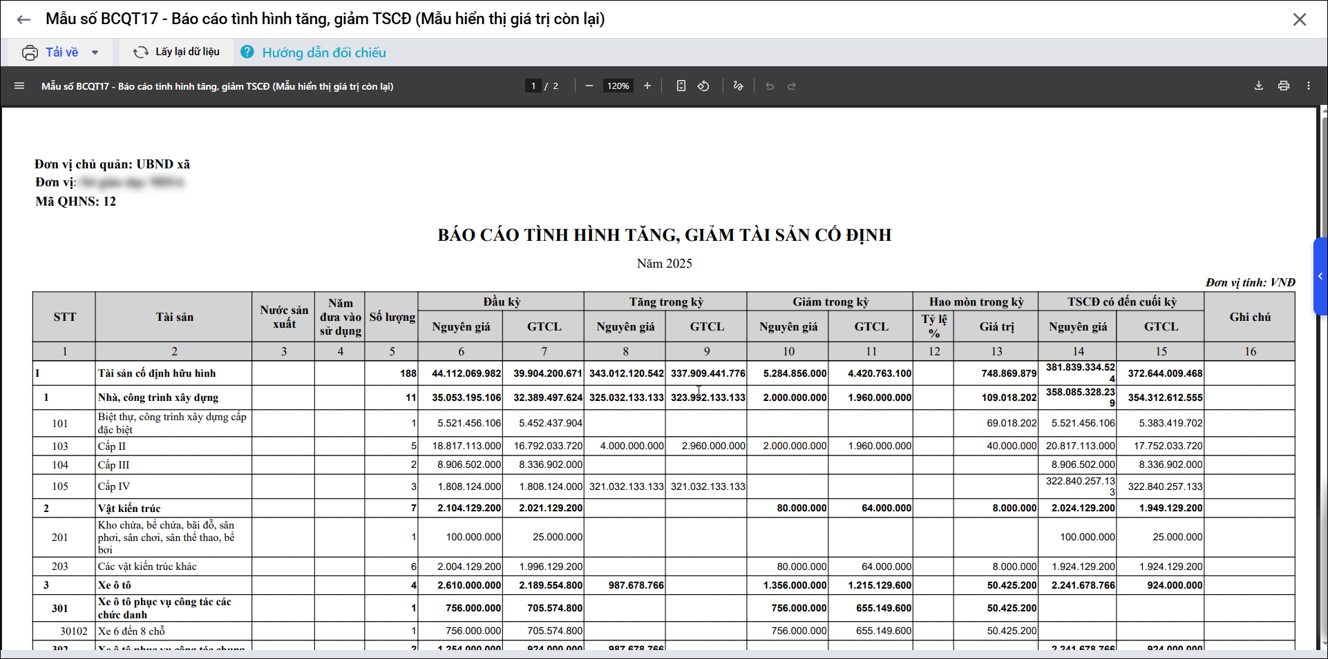 Bài viết này giúp anh/chị in được Mẫu số BCQT17 – Báo cáo tình hình tăng, giảm TSCĐ (Mẫu hiển thị giá trị còn lại).