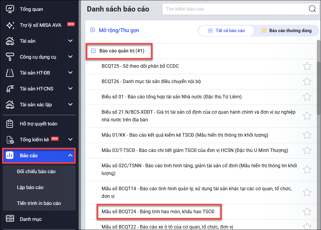 Lưu ý: Anh/chị cần lập lần lượt chứng từ Tính khấu hao sau đó lập chứng từ Tính hao mòn trước khi in báo cáo để có số liệu đúng.