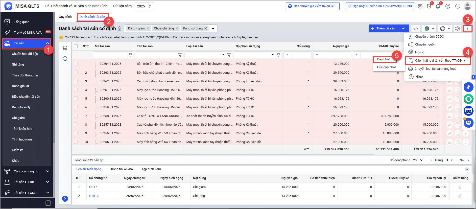 Tại màn hình Danh sách tài sản cố định, nhấn vào biểu tượng dấu ba chấm, chọn Cập nhật loại tài sản theo thông tư, sau đó chọn Cập nhật để cập nhật Quyết định số 152/2025/QĐ-UBND.