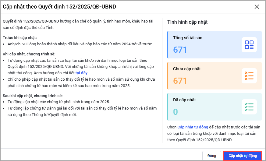 • Kể từ phiên bản R64: Quyết định số 152/2025/QĐ-UBND để quản lý tài sản theo đúng quy định của tỉnh Ninh Bình. Bổ sung thêm chức năng cập nhật Quyết định số 152/2025/QĐ-UBND để cán bộ QLTS có thể cập nhật danh mục tài sản theo quyết định này.