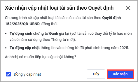 • Tích chọn Đồng ý cập nhật và chọn Xác nhận để đồng ý cập nhật tài sản theo thông tư mới.