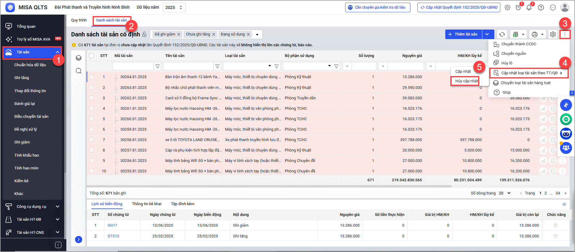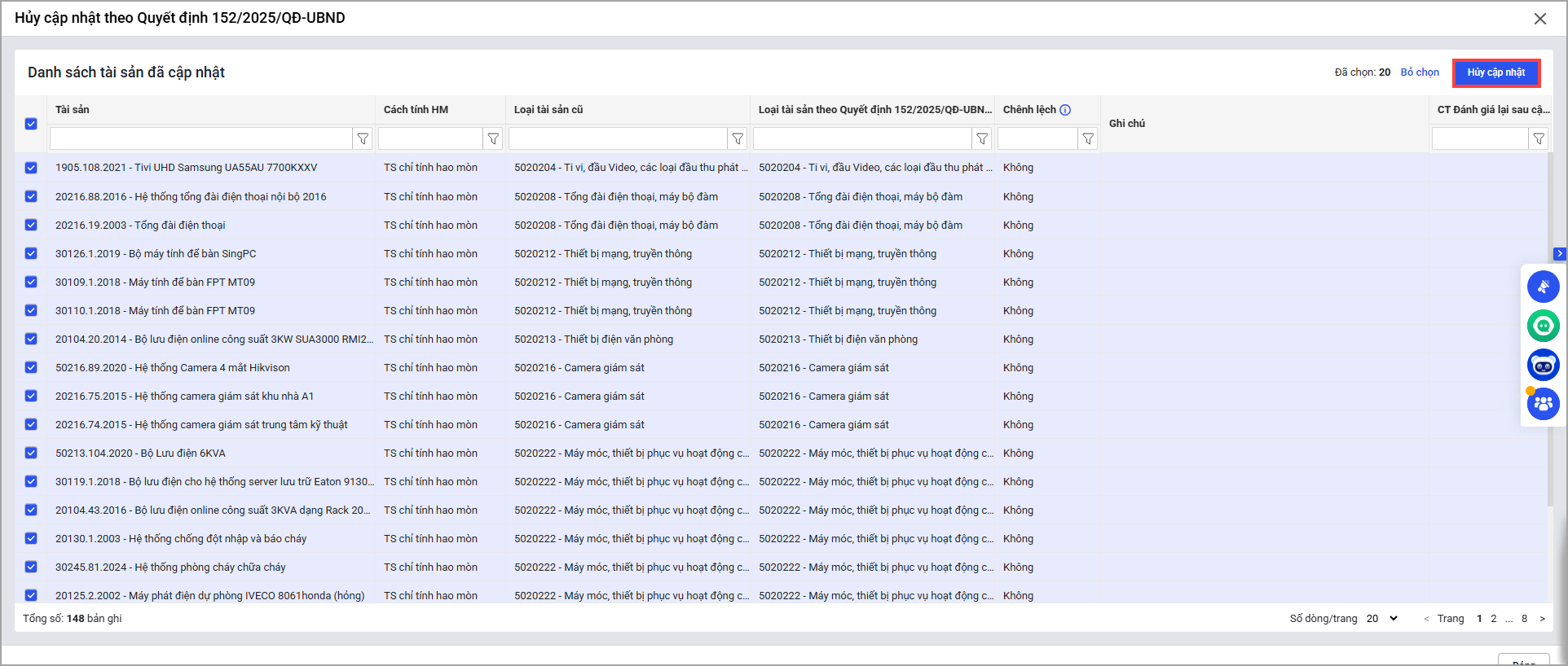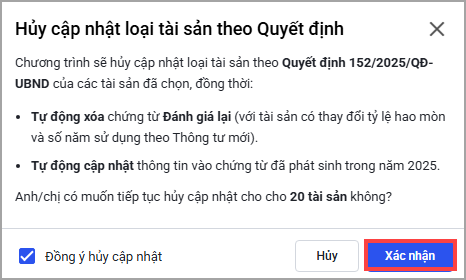 Trong trường hợp thực hiện cập nhật tài sản theo Quyết định số 152/2025/QĐ-UBND có sai sót, tính năng Hủy bỏ chuyển loại tài sản sẽ giúp lấy lại thông tin của tài sản tại thời điểm trước khi cập nhật.