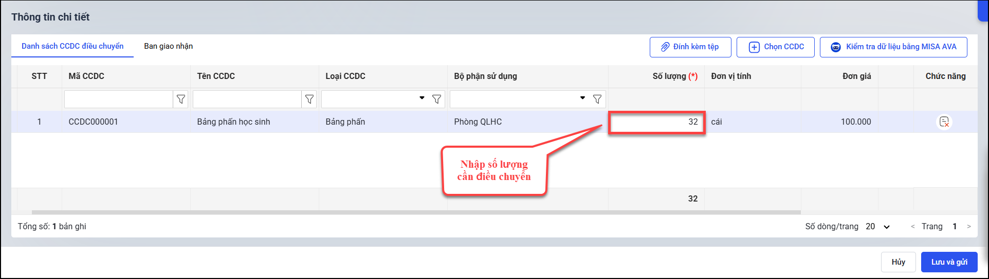 - Tích chuột trái vào ô Số lượng của dòng CCDC cần điều chuyển và nhập số lượng cần điều chuyển (Nếu cần).