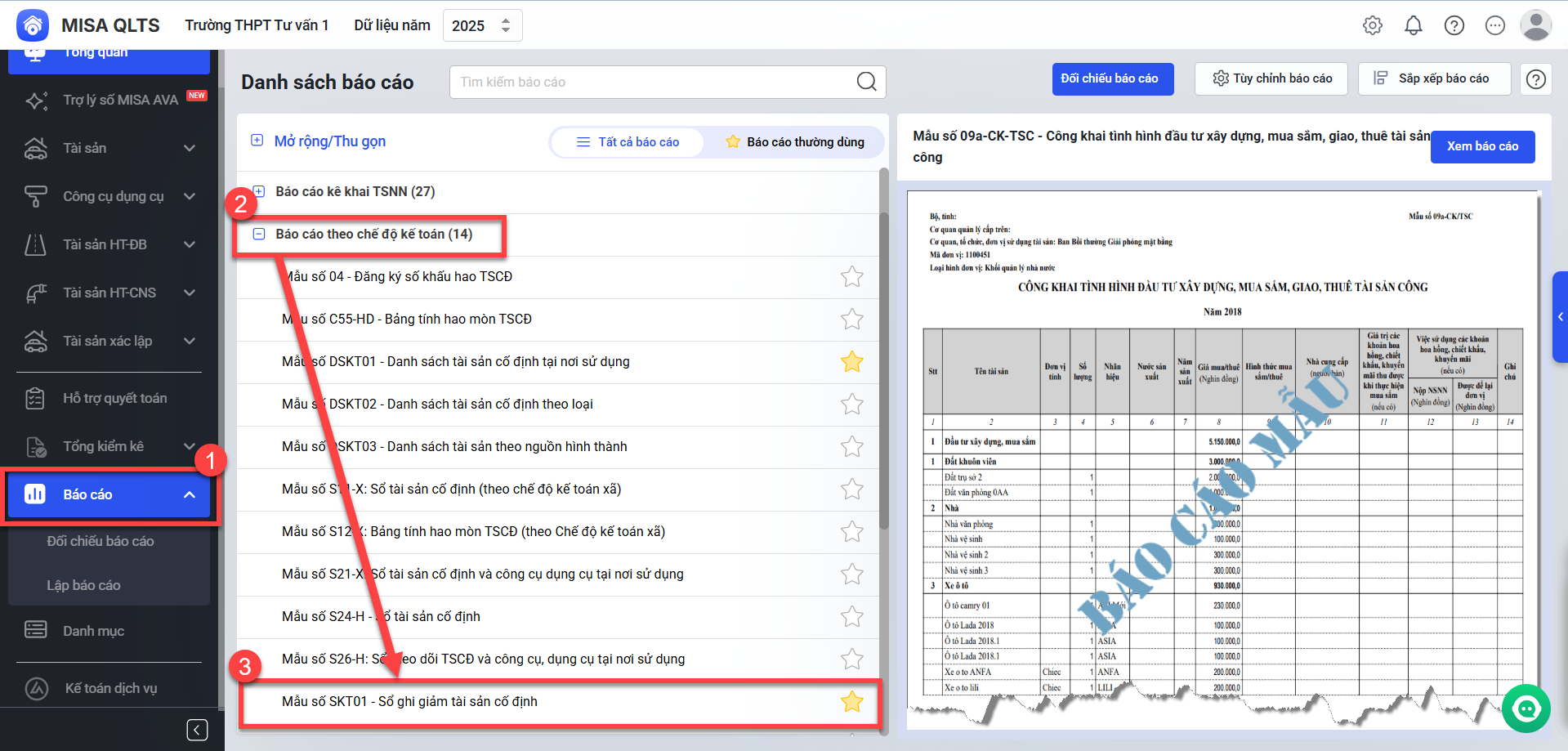 Bước 1: Vào menu Báo cáo\Báo cáo theo chế độ kế toán\chọn Mẫu số SKT01 – Sổ ghi giảm tài sản cố định.