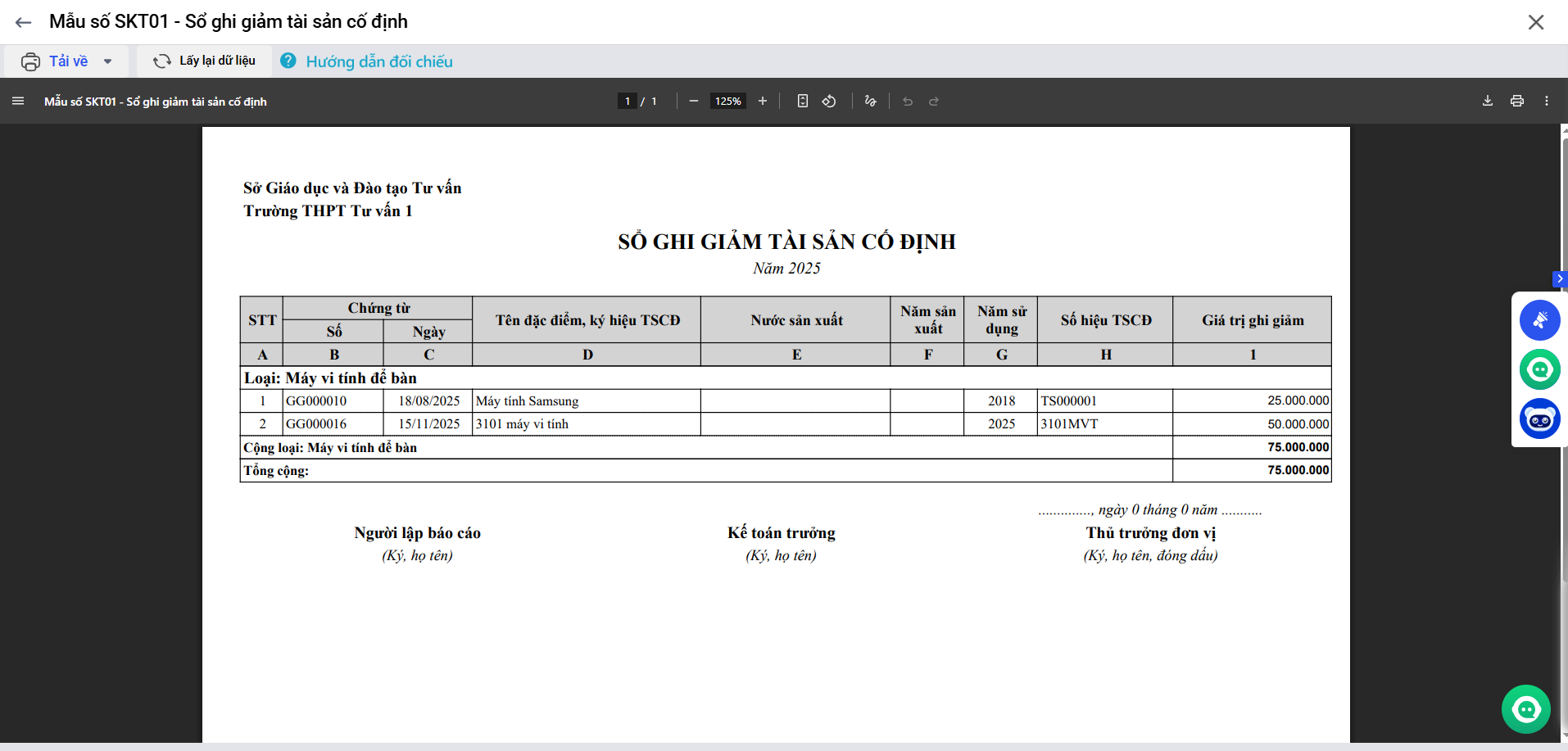 Bài viết này giúp anh/chị in được Mẫu số SKT01 – Sổ ghi giảm tài sản cố định, phục vụ mục đích quản lý danh sách tài sản đã thanh lý/ghi giảm tại đơn vị trong năm.