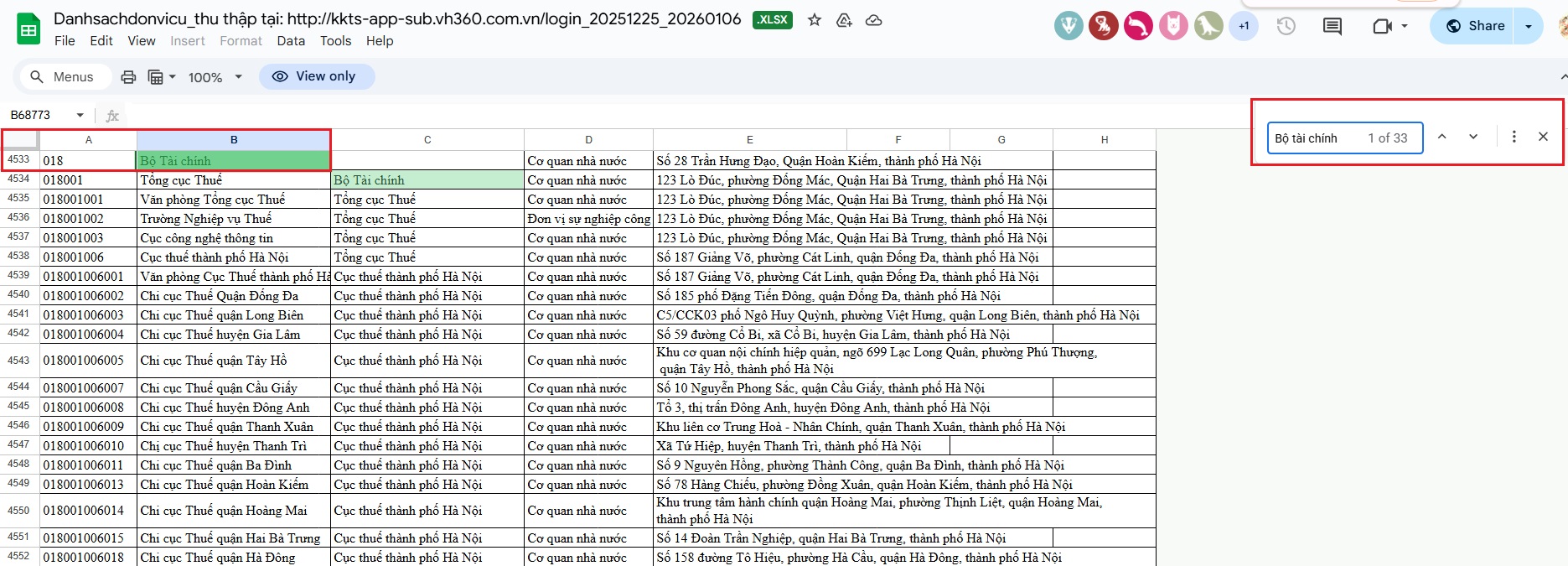 Bước 2: Trên danh sách excel phần mềm vừa mở, nhấn tổ hợp phím Ctrl+F và nhập chính xác tên đơn vị vào ô tìm kiếm (góc trên bên phải) để lọc