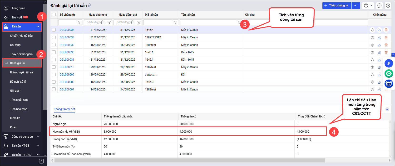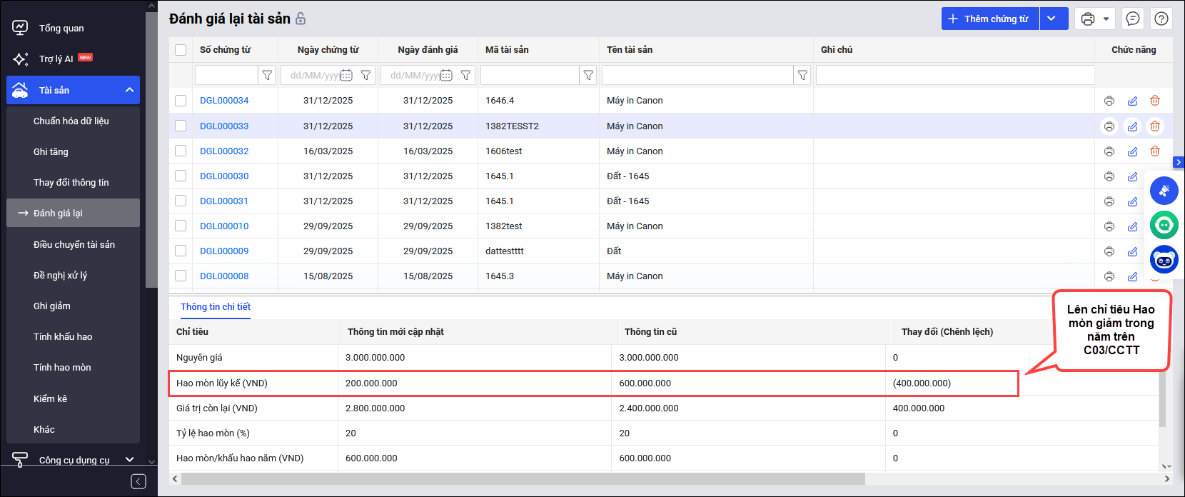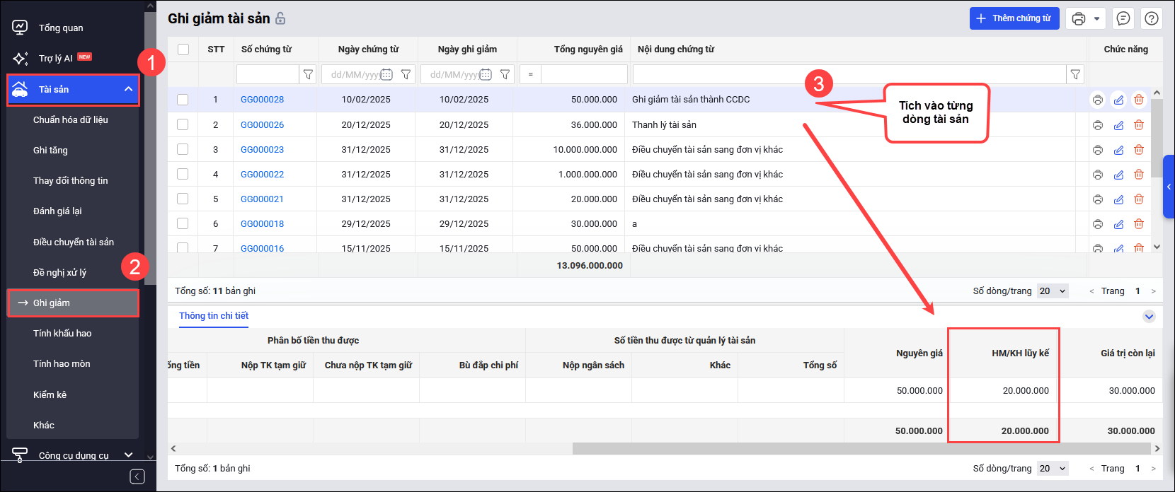 - Tích chọn từng tài sản. Sau đó nhìn xuống bên dưới phần Thông tin chi tiết, xem chỉ tiêu Hao mòn lũy kế (VND) và lấy giá trị tại cột Thay đổi (Chênh lệch).